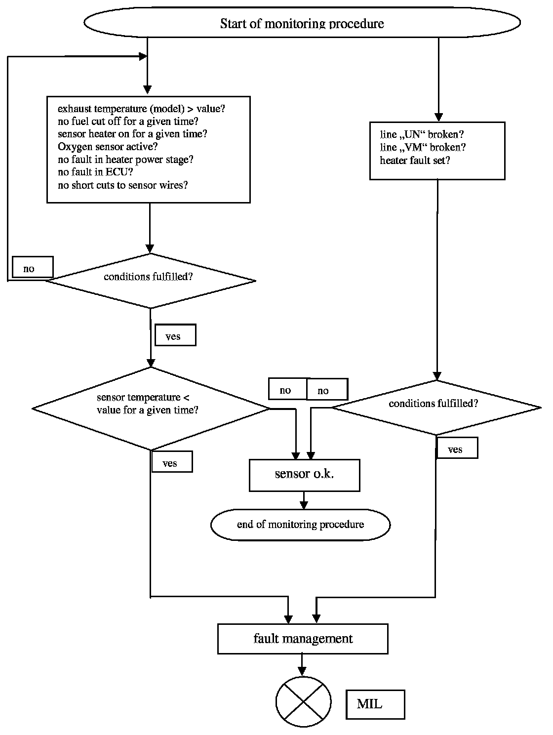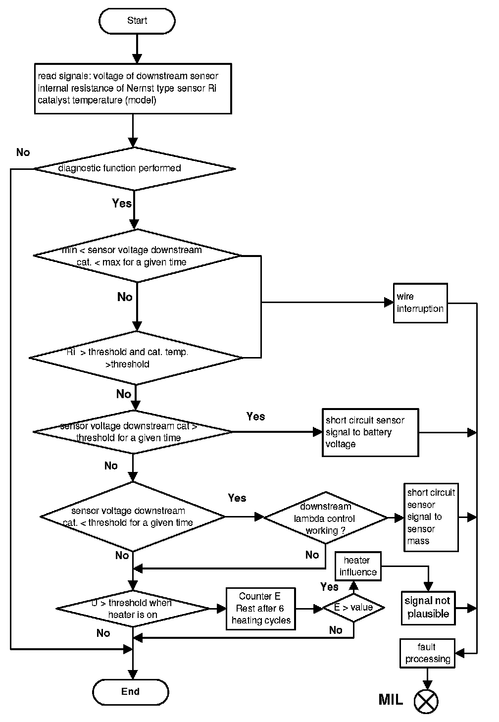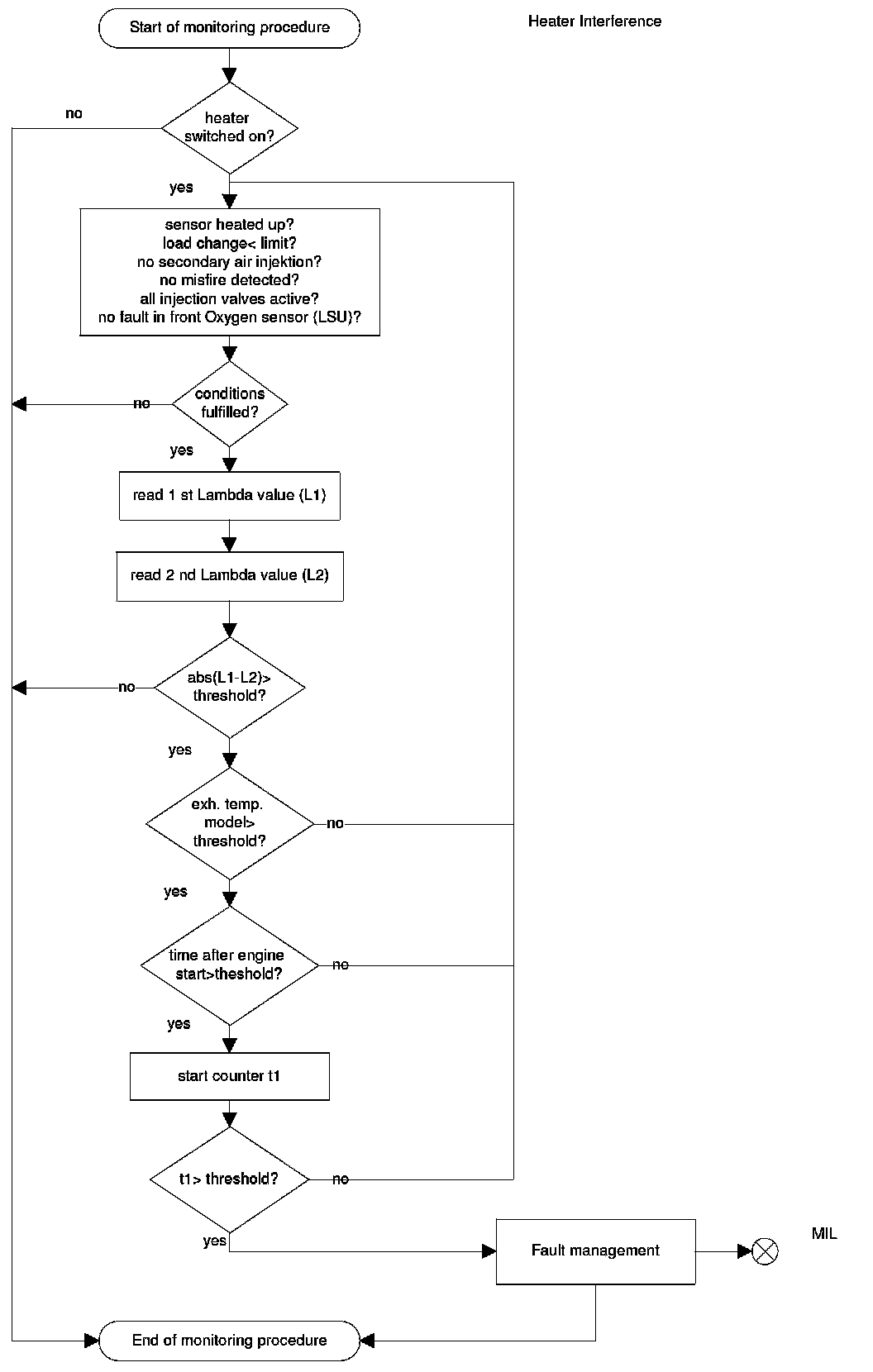 For diagnostic of the sensor heater a specific current pulse is supplied via a load resistance and the voltage is measured. The intern resistance of the sensor heater is calculated with the voltage deviation. The result will be compared with a reference map resistance, which considers aging and sampling deviations. In case of internal resistance > map resistance the diagnosis stores a fault and the MIL will be illuminated.