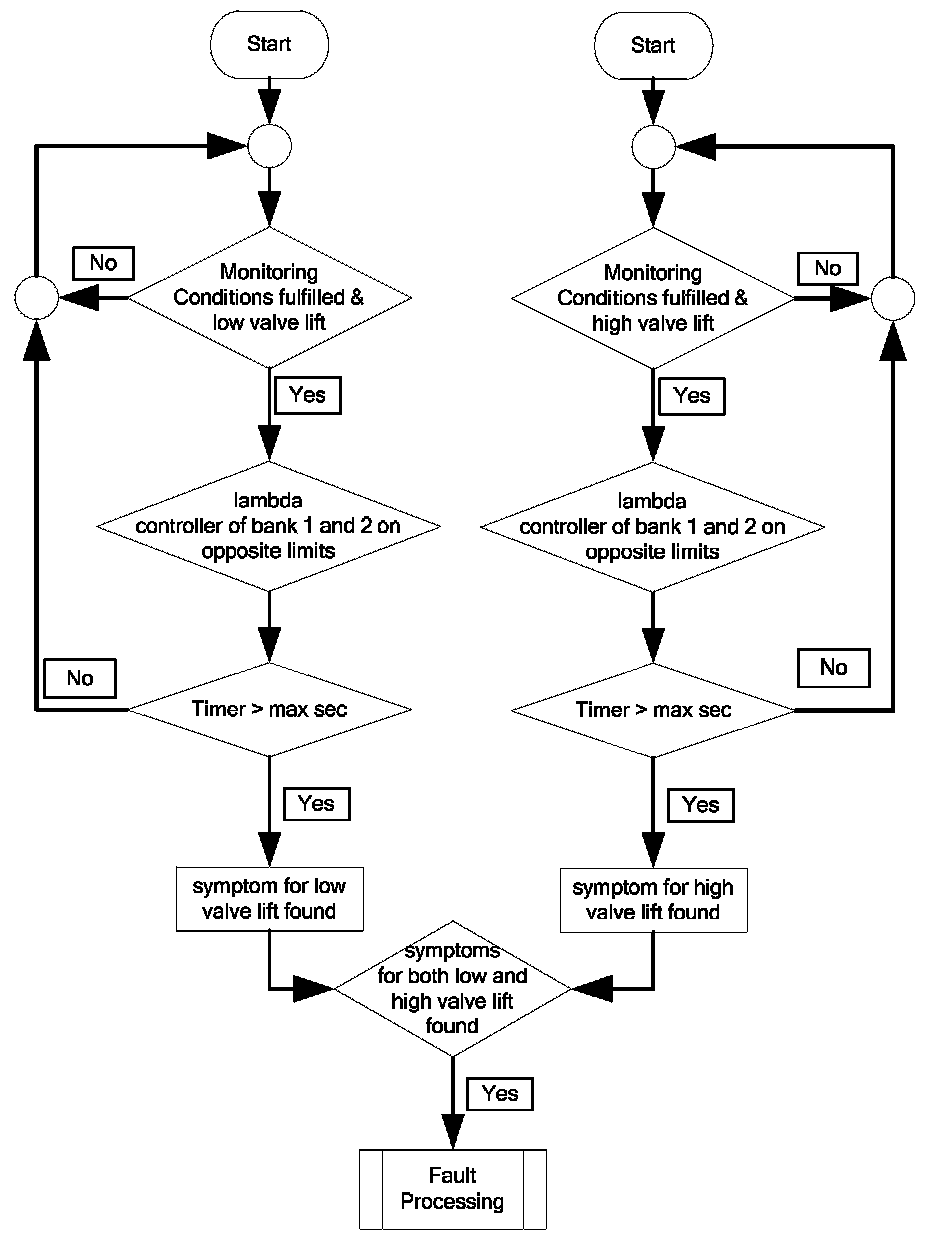 If the Lambda control output exceeds the threshold in the direction R2L or stucks at a limit for the required amount of time, the threshold or the limit must achieve the opposite direction (L2R) for the required amount of time. Then an error counter is incremented. The thresholds are expected to always be reciprocally exceeded, which means that if the rich threshold is exceeded, then the lean threshold must be exceeded. Otherwise the rich counter will not be further incremented.