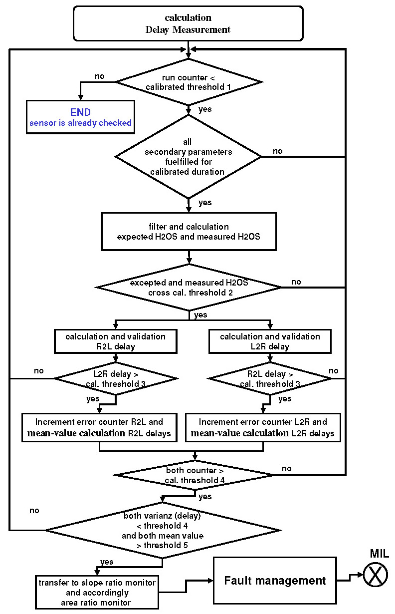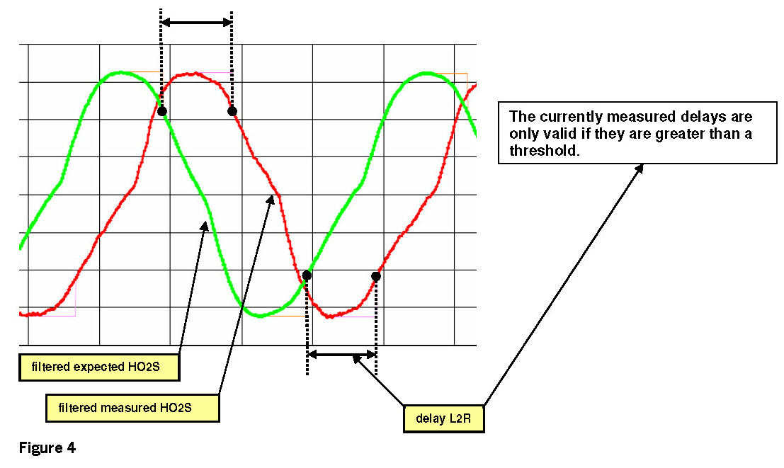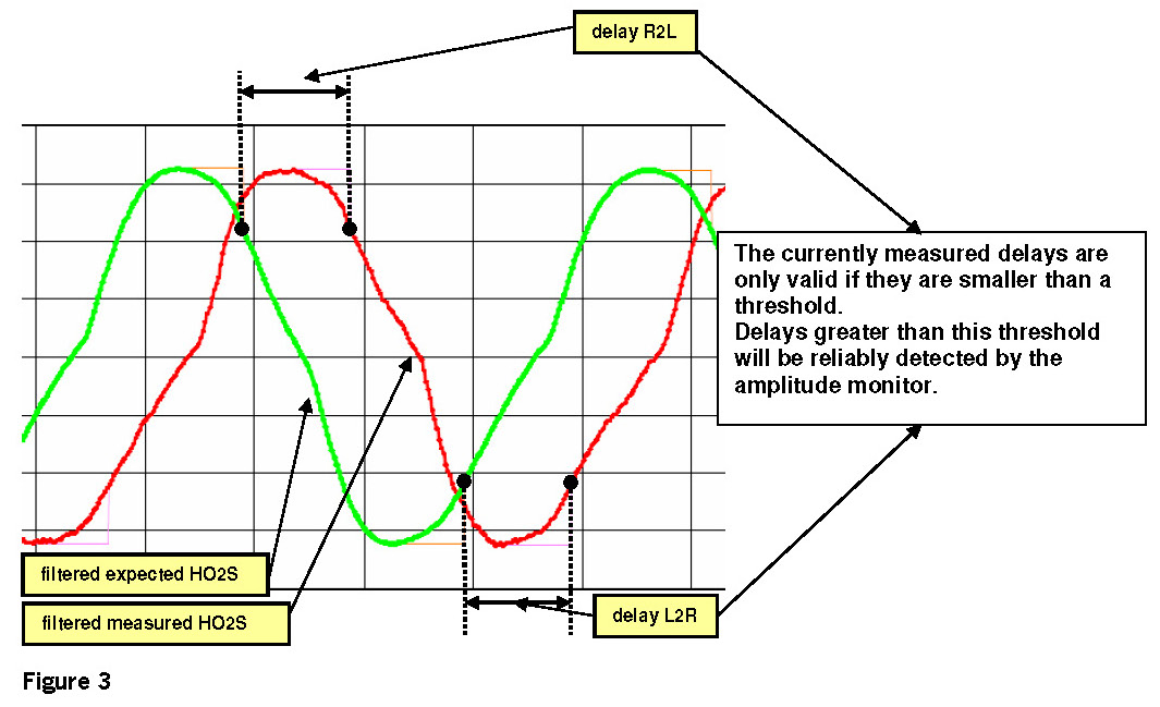 Pure delay is not known as a fault mode of a wideband O2S, but the detection of a pure delay is required by regulation. A delayed response could affect the catalyst diagnostic and lead to higher emissions. Therefore this additional function monitors the HO2S Response. The monitor is performed once per driving cycle as long as the enable conditions are met and consists of two parts of monitors. The Amplitude Monitor and the Delay Measurement monitoring function. These partial functions of the Response Rate Monitor are designed strictly for symmetrical delay recognition (both slopes R2L and L2R are influenced).
