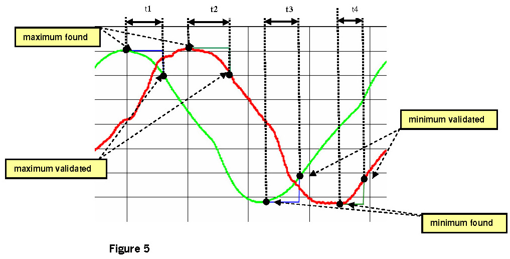 - Time period (figure 5: t1..t4) between recognised maximum or minimum values and their confirmations is within a calibrated range (typical range: ~0.02-2s)