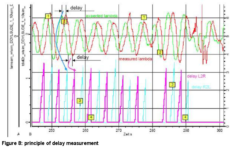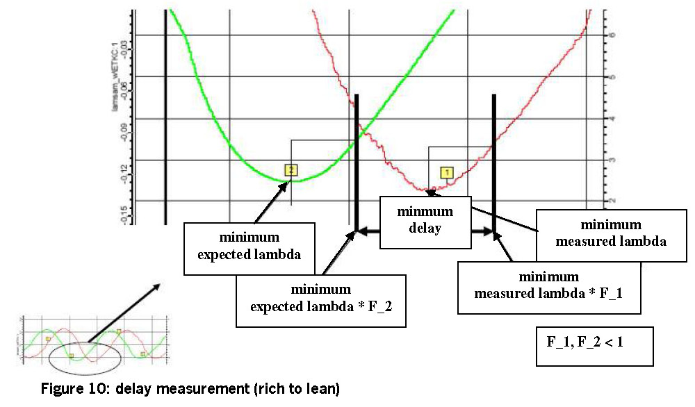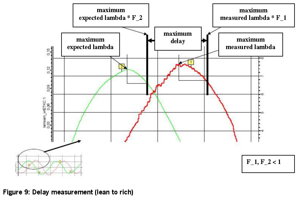 An exact measurement of the delay time is not always possible, it is recommended to first evaluate it from an applicable minimum amplitude (typical value: ~ 0.03-0.08) of the filtered measured and expected signal. If the threshold value is exceeded, a time measurement begins and the corresponding maxima (rich) or minima (lean) is determined for the expected and measured signal. The time measurement is triggered after the maxima or minima of the expected and measured signal is reliably recognised. A minimal signal change in the opposite direction is required (secure recognition of the turning points in the signal courses).