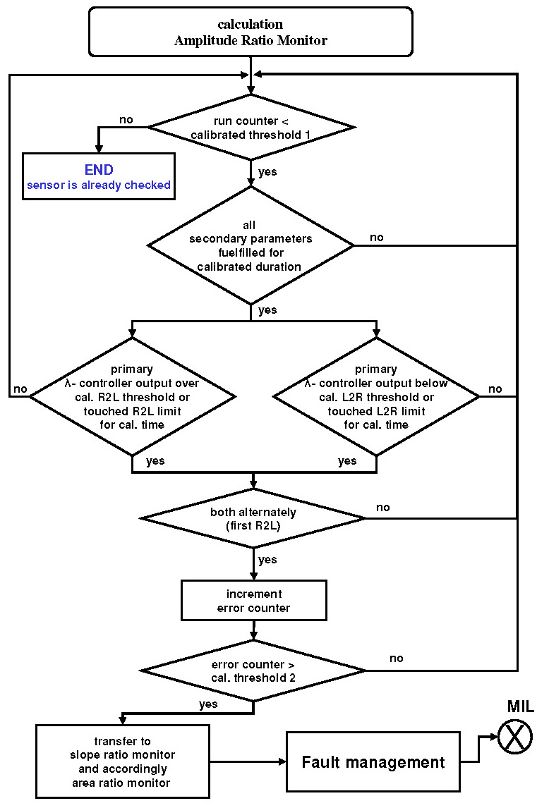 If the enable conditions are met, the measured value of the amplitude monitor is valid. In order to avoid misdetection from, for example, disturbance by load alternation, the thresholds must be calibrated at a relatively high values (typical value: lean ~ 1.18; rich ~ 0.82). For this reason a robust fault detection below a minimal control deviation is not possible. Furthermore, the time, which stuck the control factor at its limits or over the calibrated thresholds, must be greater than a calibrated time threshold (typical value: ~ 0.1-0.5 s).