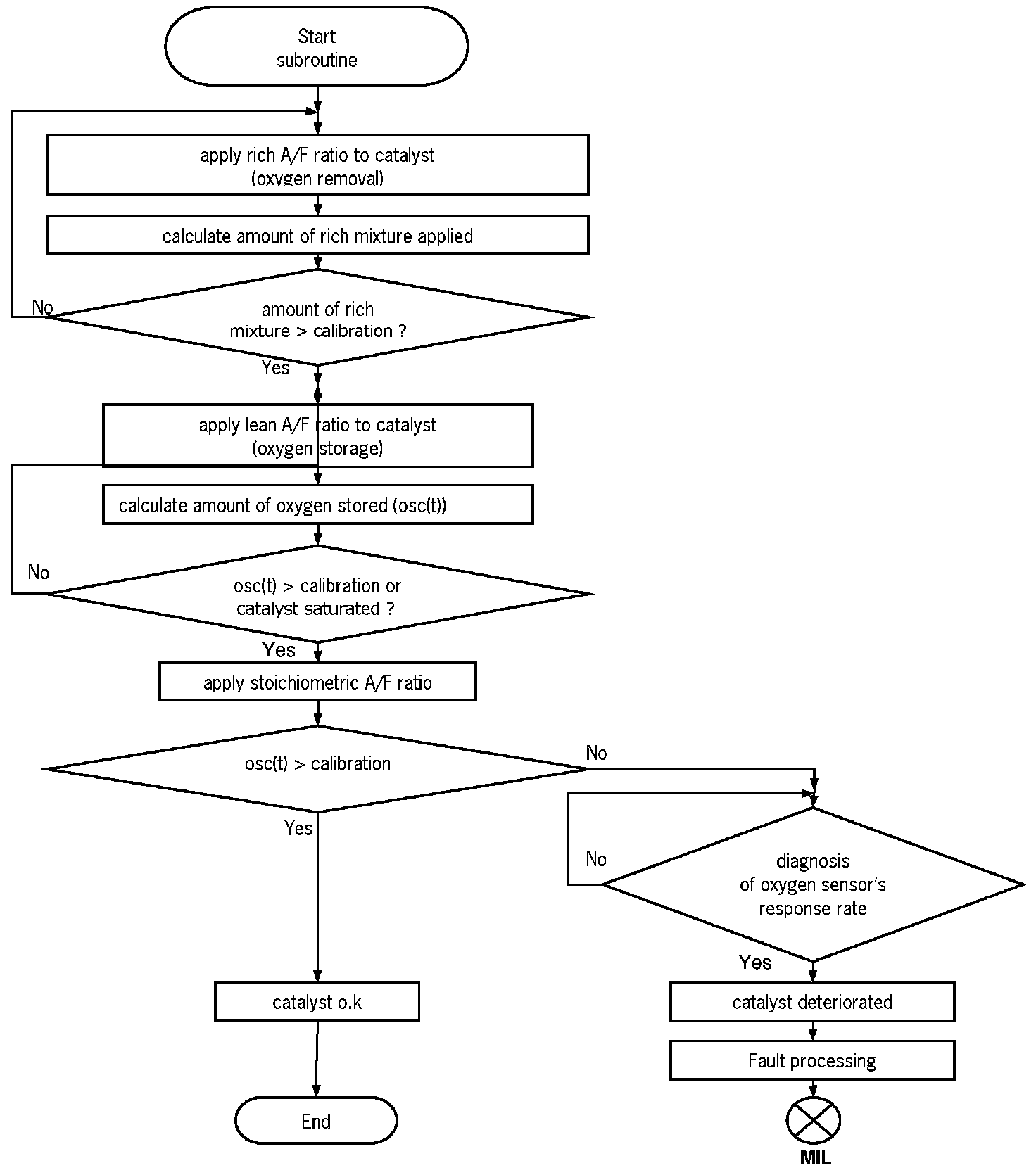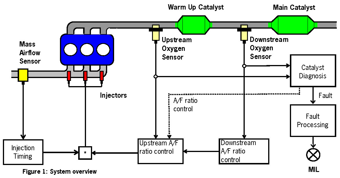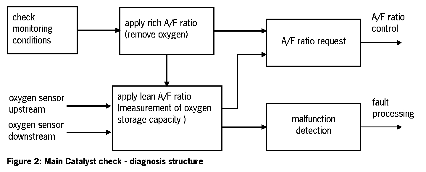 The main catalyst check is based on the direct measurement of the catalyst's OSC during the transition from a rich to a lean air-fuel mixture. The required set up is depicted in figure 1. The air-fuel ratio can be precisely determined with the upstream wide band oxygen sensor. The downstream oxygen sensor delivers information about the OSC of the catalyst.