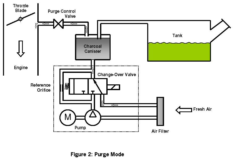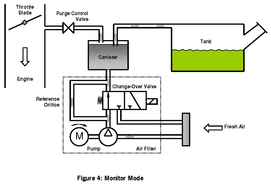 In the Monitoring Mode (Fig. 4) the change-over valve is switched on while the purge control valve remains closed. The motor current drops to a zero-load level. Fresh air is now pumped through the charcoal canister into the tank. A small overpressure, indicated by an increase in the motor current, builds up if the evaporative system is tight.
