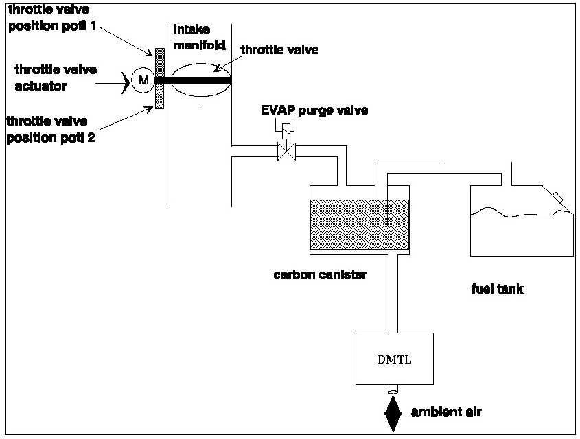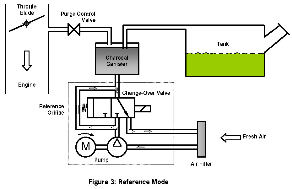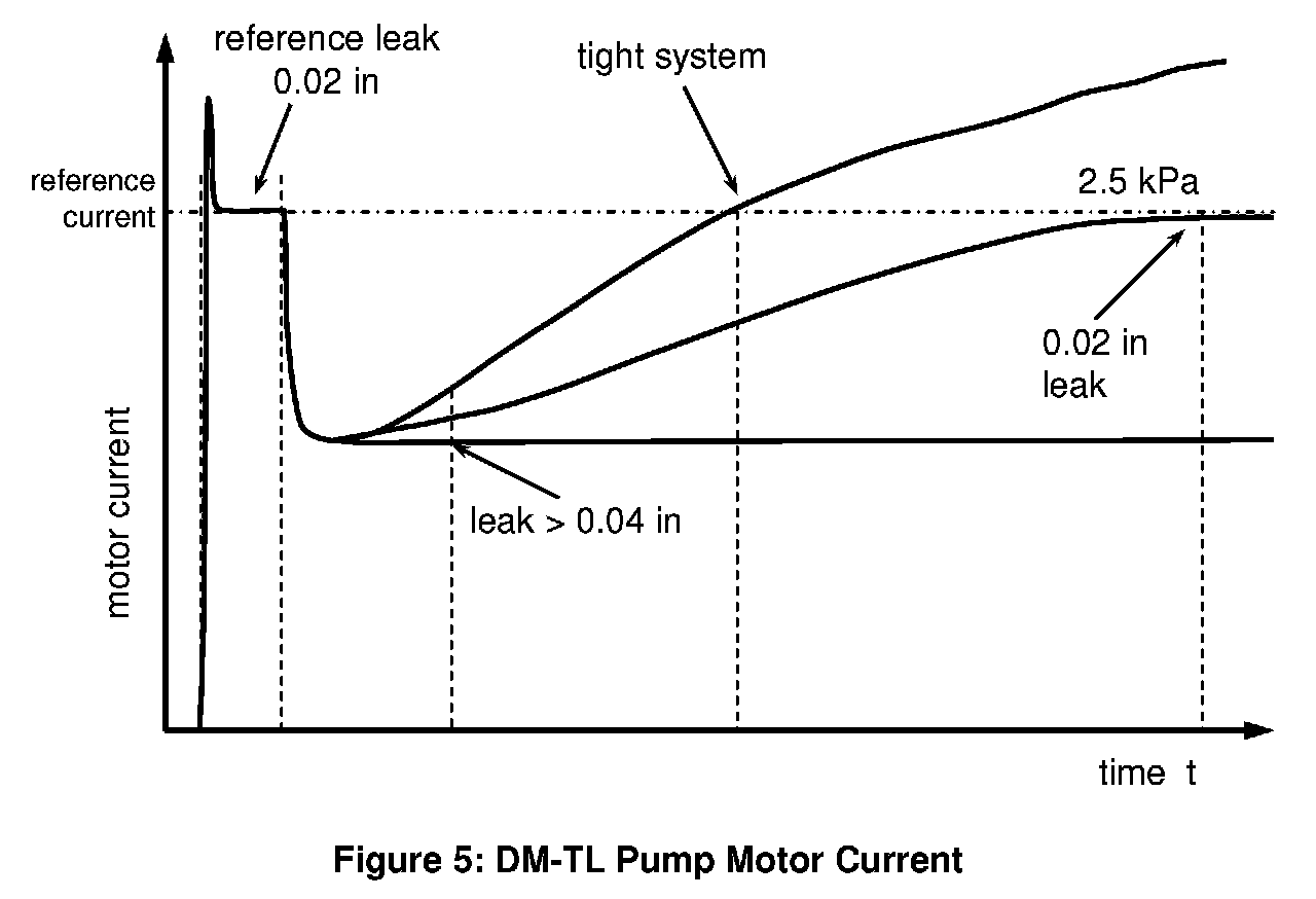 The DM-TL (Diagnostic Module Tank Leakage) is used for monitoring the evaporative system for small (> 0.02 in) and rough (> 0.04 in) leaks. It consists of an electrically driven air pump, a change-over valve and a 0.02 inch orifice for reference measurement - see Fig. 1. The tightness of the tank system is obtained by comparing the actual air pump's motor current with that measured when the system is operated with a standardized reference orifice.