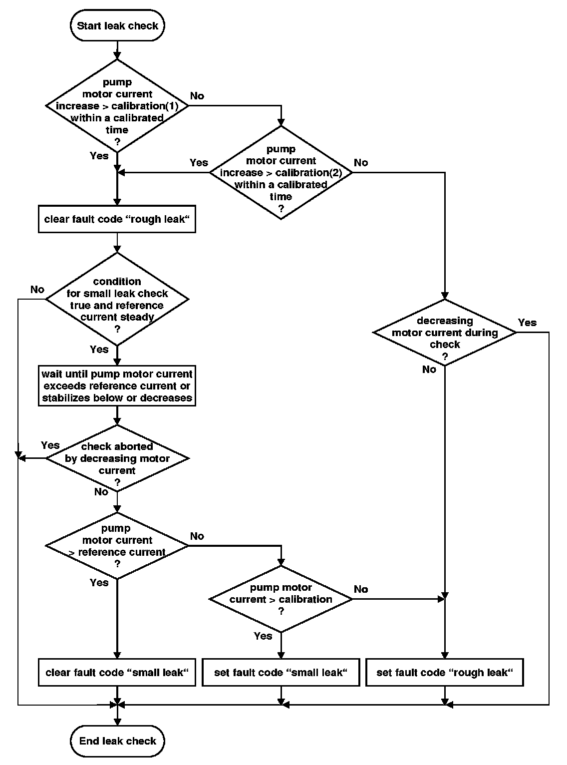 The small leak check is performed if and only if the rough leak check has been performed and no rough leak was detected. If the enable conditions for the small leak check (> 0.02 in) are fulfilled, the pump's motor remains in the active state (monitoring mode) until its current exceeds the reference current, or the motor current gradient is close to zero (current stabilizes below the reference current). If the motor current exceeds the reference current, the evaporative system is considered as tight. A small leak is assumed only if a second small leak check confirms a current stabilization below the reference current.
