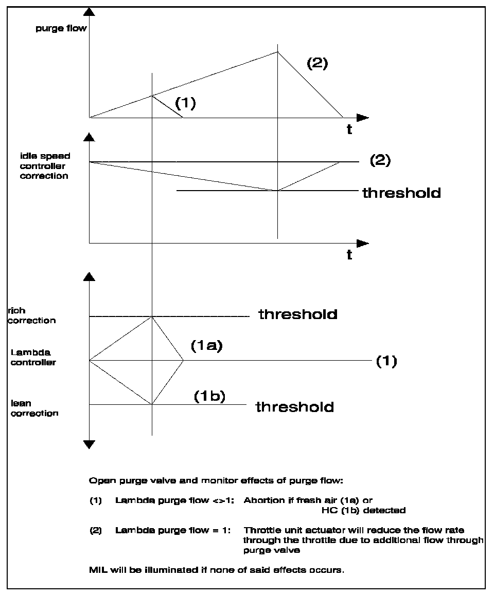 If mixture compensation or reduction of the airflow through the throttle unit does not occur for two diagnosis cycles, then a defective EVAP Purge Valve is assumed and the MIL is illuminated.