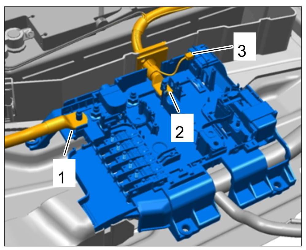 8. Loosen nuts -1 and 2- on the ground and B+ lines and remove lines from the power distributor.