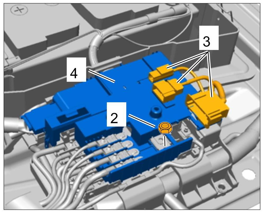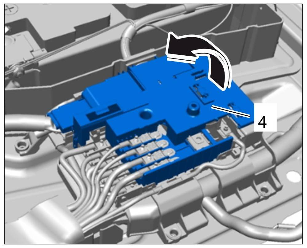 6. Carefully turn the large plastic cover -4- on the power distributor to the side.