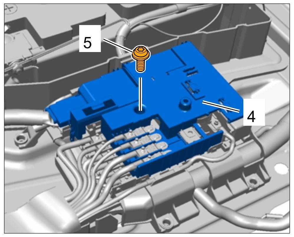 4. Carefully position the large plastic cover -4- on the power distributor, clip it in at the sides and secure the plastic cover with the fastening screw -5-.
