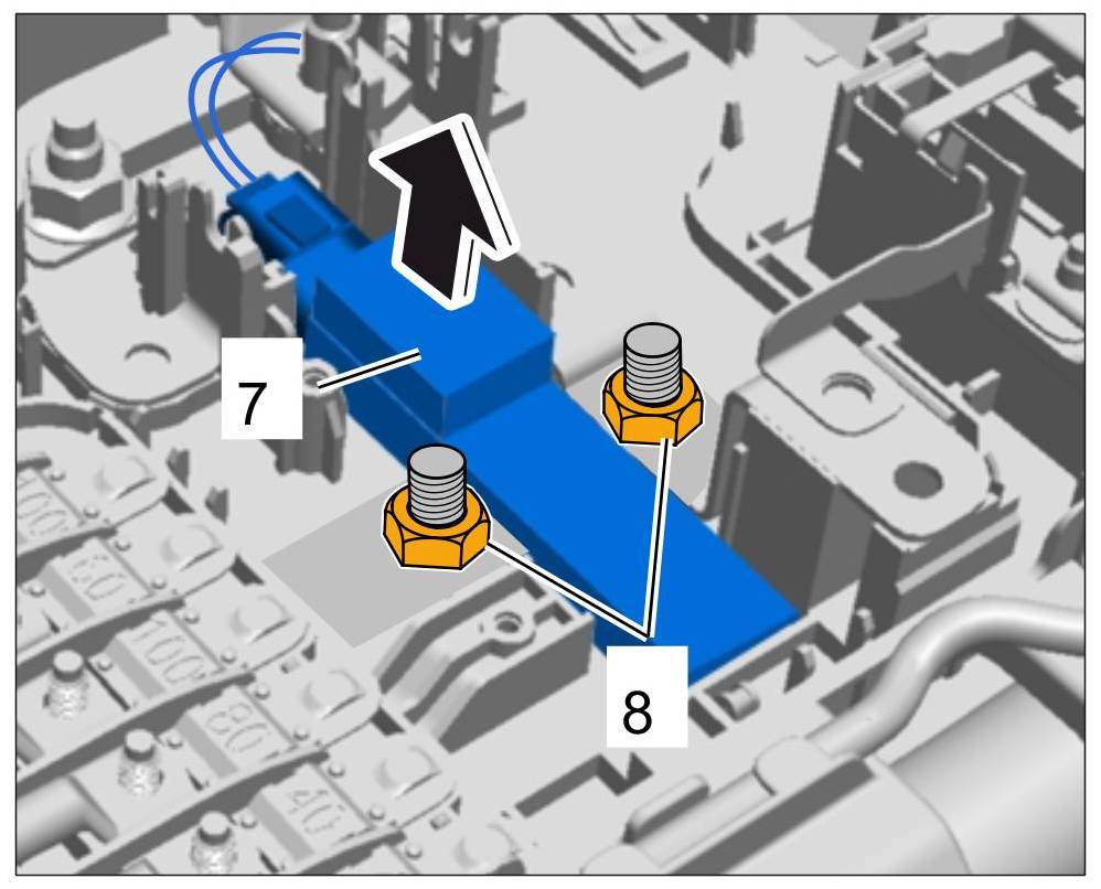 8. Screw off two fastening nuts -8- and remove the cutoff relay -7- by pulling it up.
