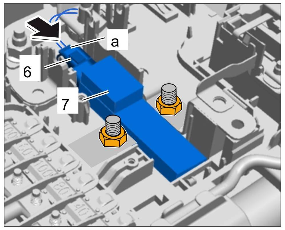 3. Plug electric plug connection -6- into the cutoff relay -7- and lock it -a-.