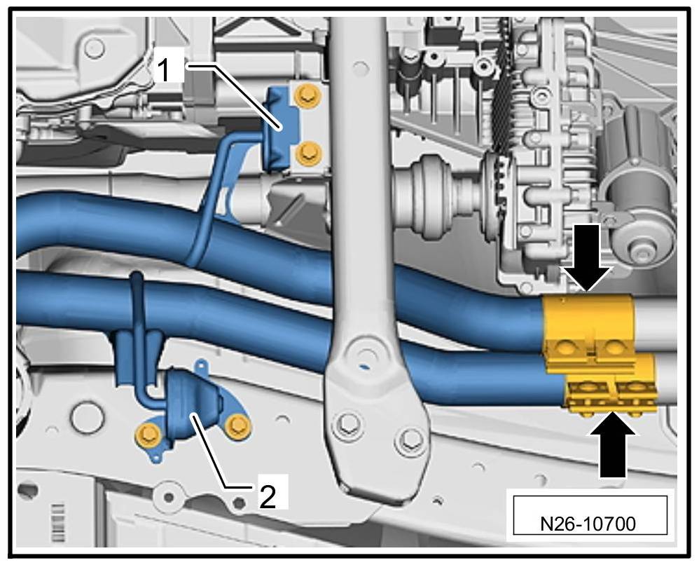 5. Screw off suspension -1- and -2-. Loosen clamps -arrows-.