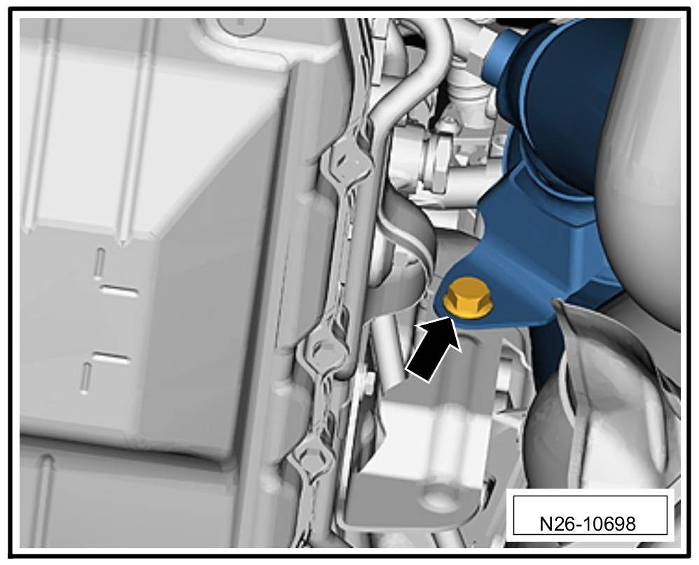 10. Unscrew fastening screw -arrow- for the catalytic converter on bank 2.