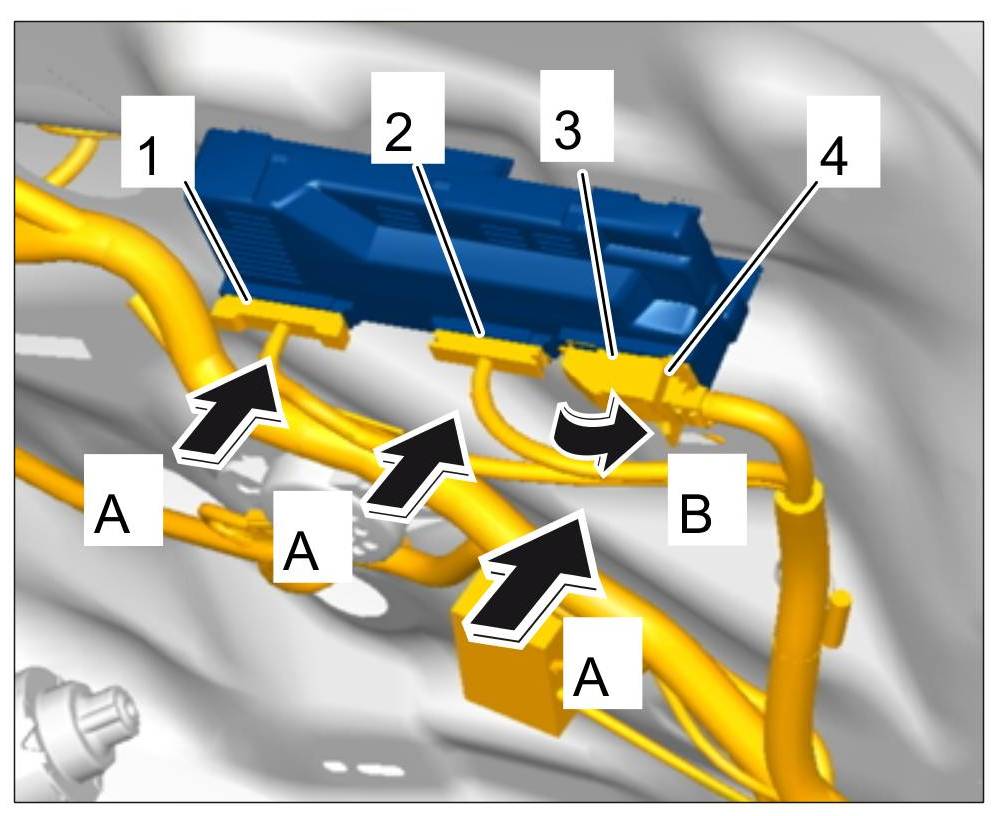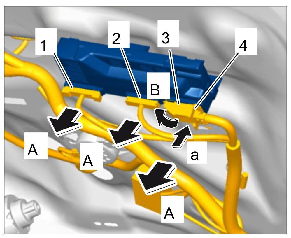 2. Release electric plug connection -3- ( -a- ) and turn release element -4- 90° anti-clockwise -B-. Pull electric plug connection off control unit for rear lid.