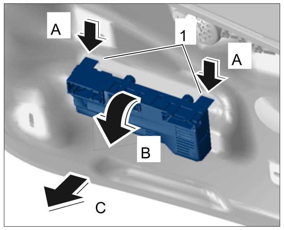 3. Release the two clips -1- ( -A- ) and remove control unit for rear lid by swivelling it -B- out of the opening in the holder -C-.