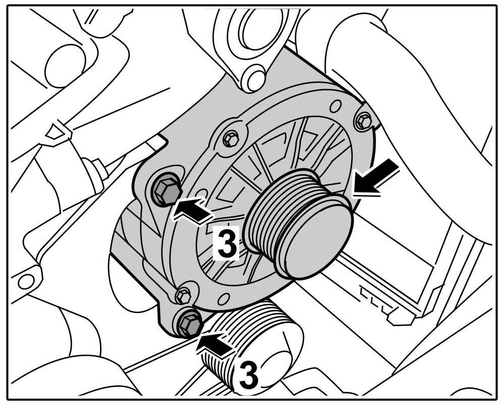 2. Place the generator in installation position -arrow- and secure with the fastening screws -arrows 3-. => Tightening torque: 20 Nm (15 ftlb.)