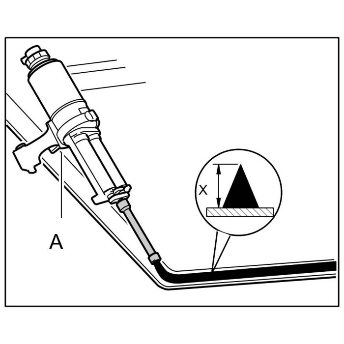 2.1. Using a bonding gun -A- apply 2-component adhesive to the rear window along the precoating or on the primer in the form of a triangular bead measuring -X = approx. 15 mm-.