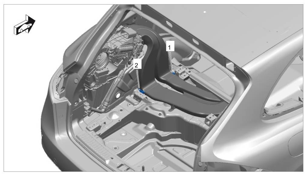 1. Loosen the screw -1- on the left support for the luggage compartment cover and remove the support -2-.