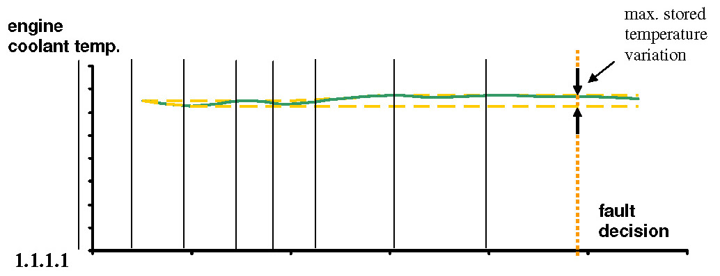 After engine start the system stores continuously the lowest and highest ECT. In case that after several driving conditions the difference between ECT max and ECT min is lower than the threshold stuck signal error is detected.