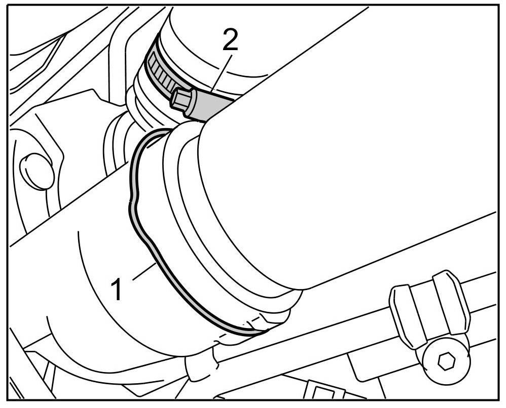 Release hose connections on the turbocharger. To do this, pull out the locking spring -1- on the adapter for the pressure pipe for the turbocharger. Then loosen the hose clamp -2- on the pressure pipe at the turbocharger.
