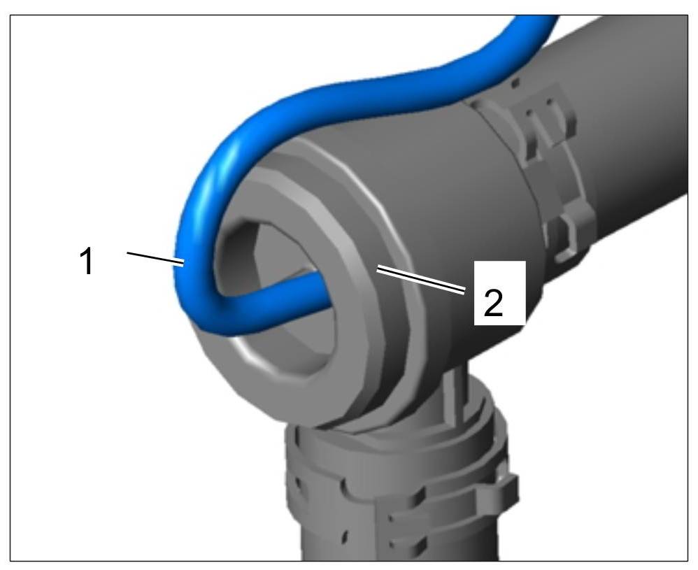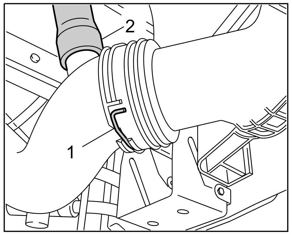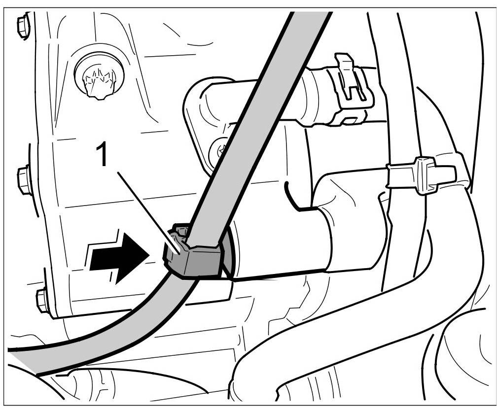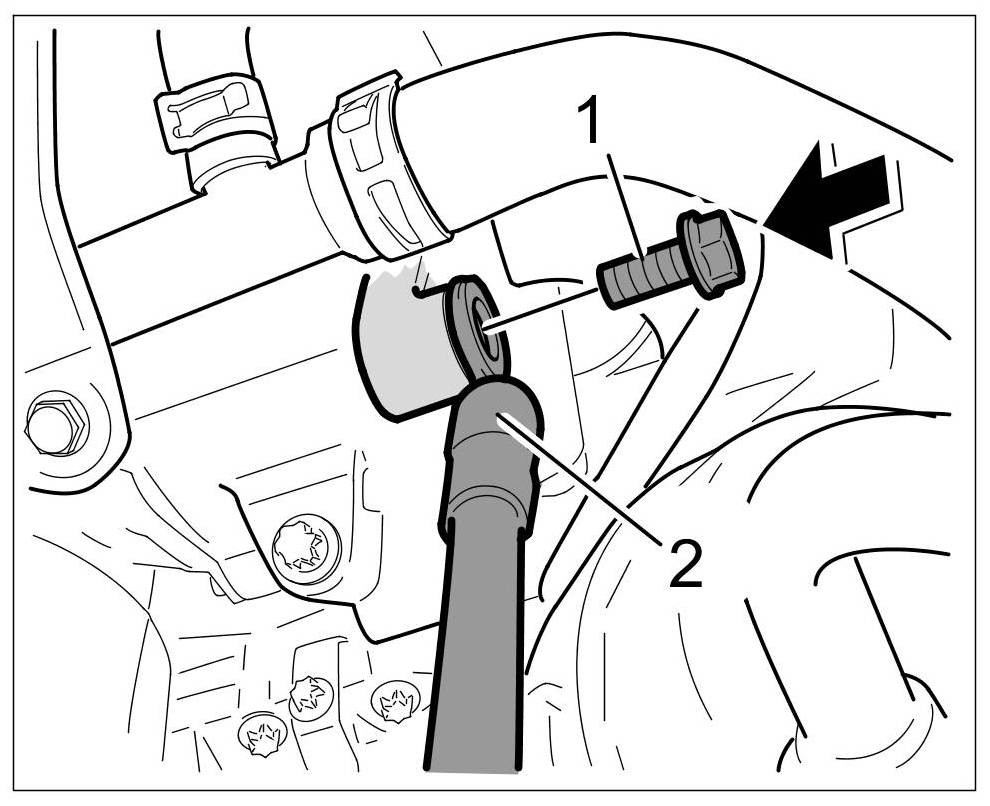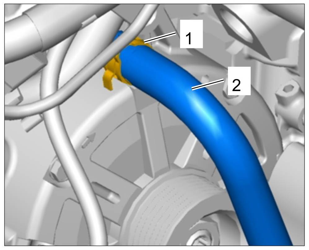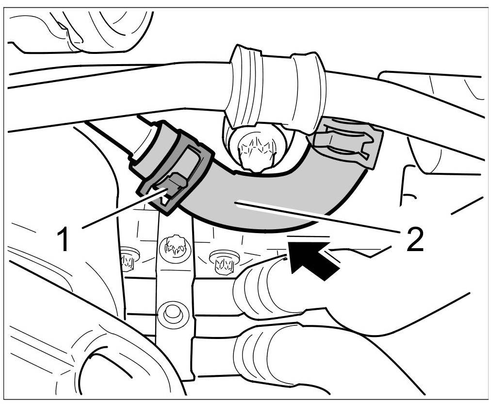 10. Clip coolant return hose -1- into the holder -2-.