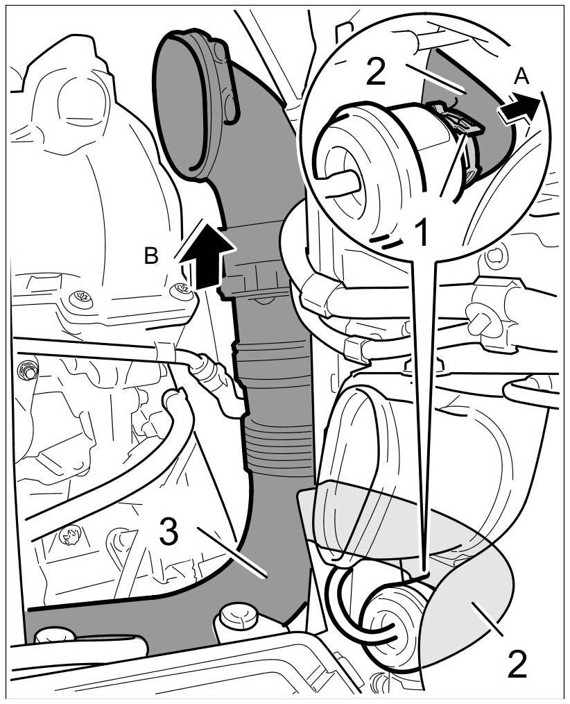 Remove clamp -1- on the ambient air valve and pull off the hose -2- ( -A- ). Lift charge air hose -3- up and remove it -B-.