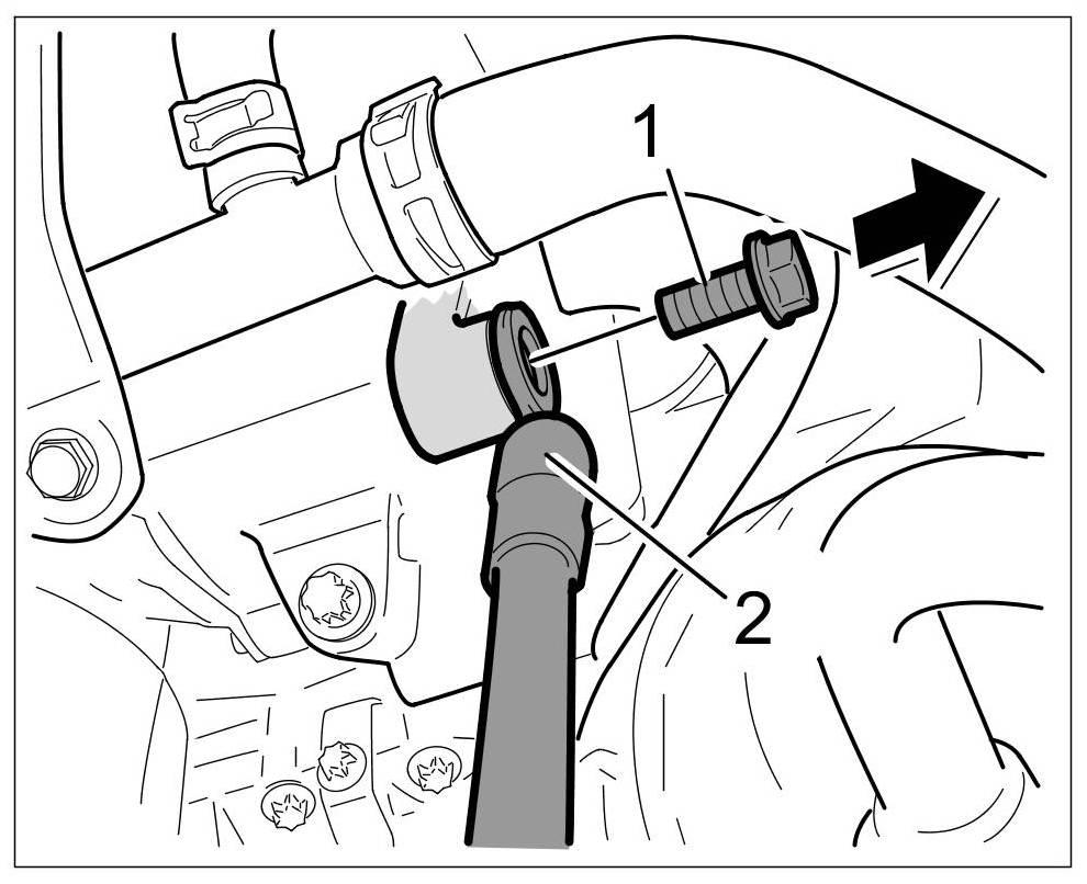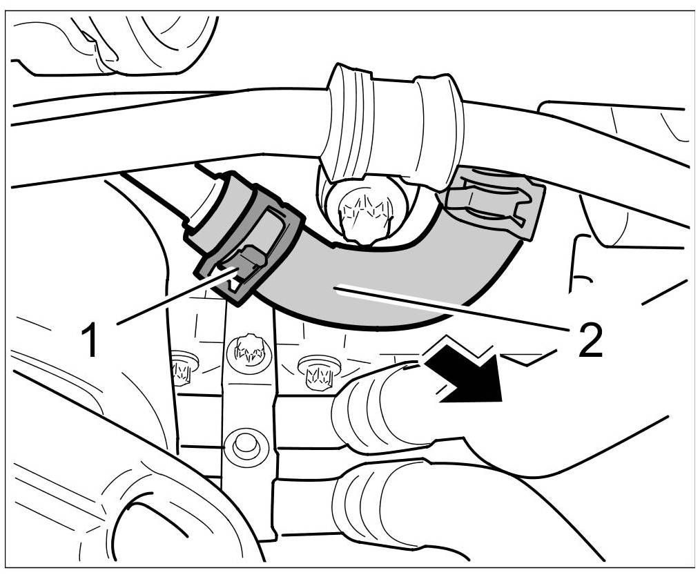 10. Unclip coolant return hose -1- from the holder -2-.