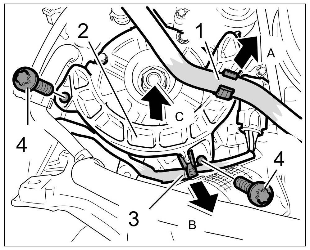 12.3. Clip in coolant return hose -1- at the impact bracket -C-.