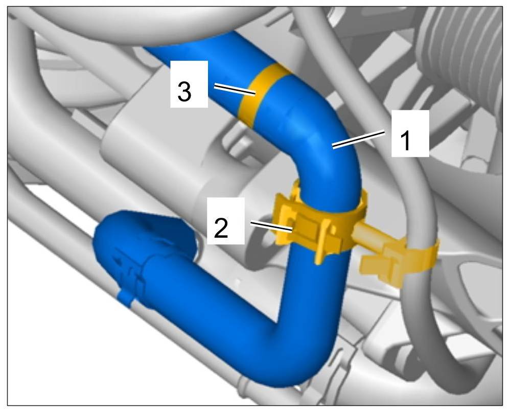 9. Connect the coolant return hose -1- and fit the clamp -3-.