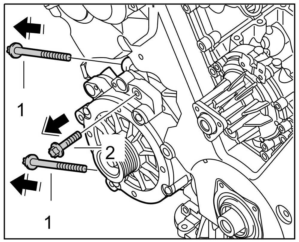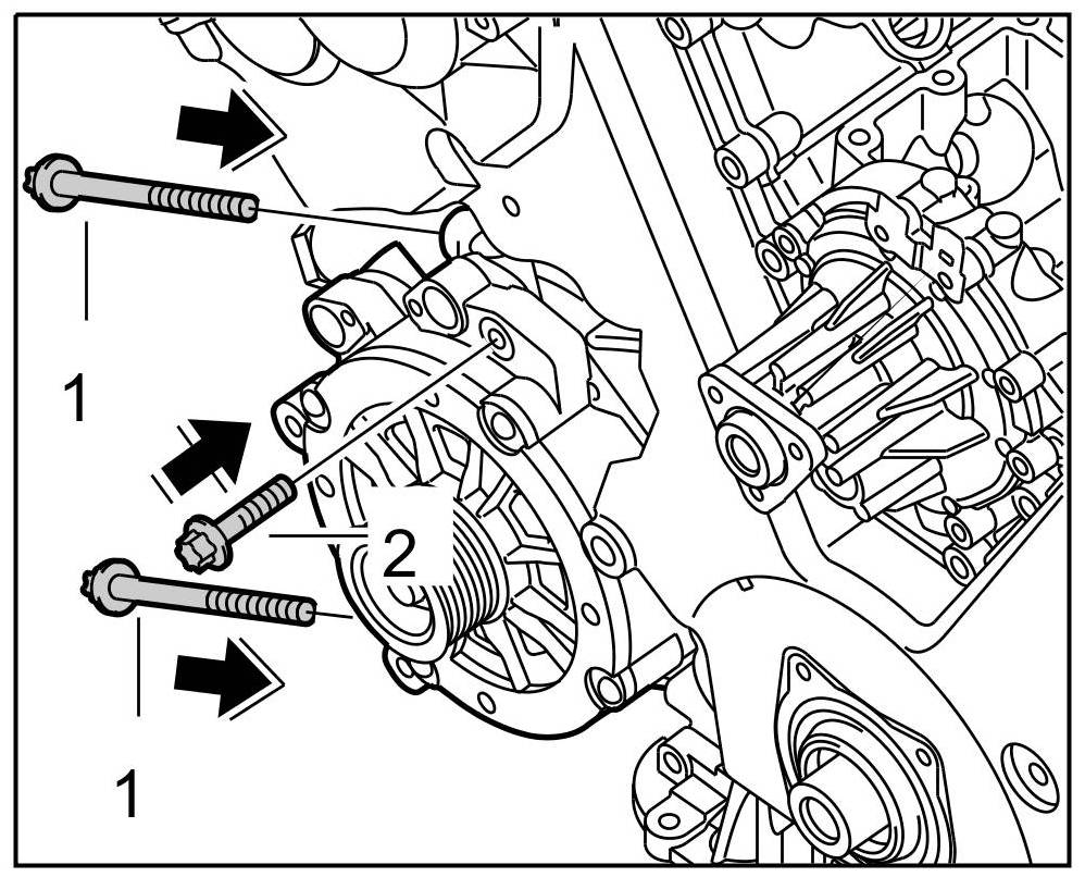 4. Fit and tighten the three fastening screws -1, 2- ( -arrows- ). => Tightening torque: 23 Nm (17 ftlb.)