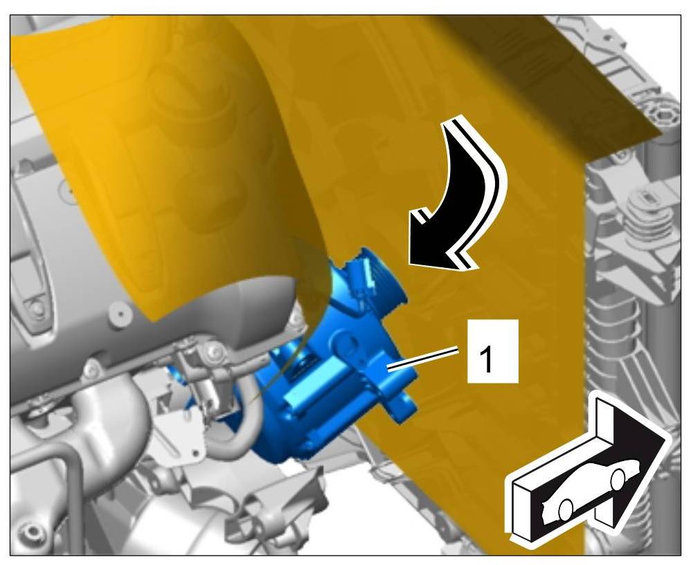 Fit the generator -1- down into the vehicle from the front -arrow- and position it.