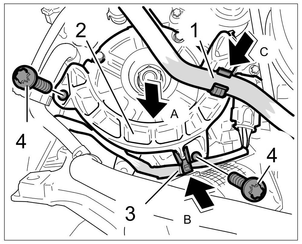 12.3. Open the retaining clip -3- ( -arrow B- ) and remove the B+ line -4- ( -arrow C- ).
