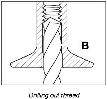 Drill out old thread as far as the base of the thread using a drill bit contained in the M10 or M14 kit B.