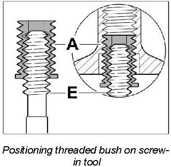 Screw threaded bush A in fully (note bush length classification) using the screw-in tool E.