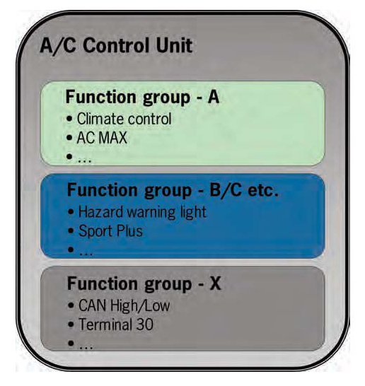 Several comfort functions are integrated in the Panamera thanks to the new operating concept in the operator control units. The inputs and outputs for these are subdivided into various function groups. Concept of the front operator control unit. (Operator control unit = OCU or OCE*)
