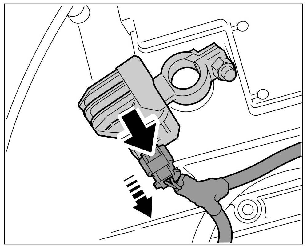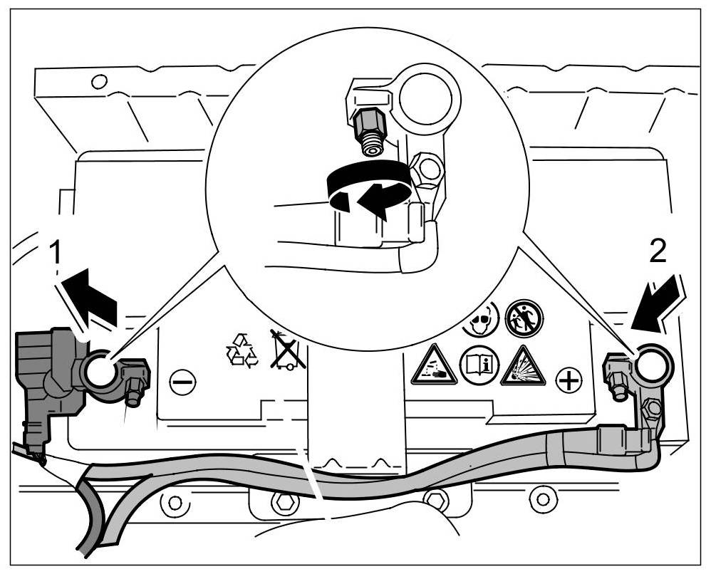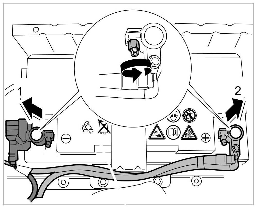 4. Screw off fastening nut -2- on the body and remove the ground strap and battery sensor.