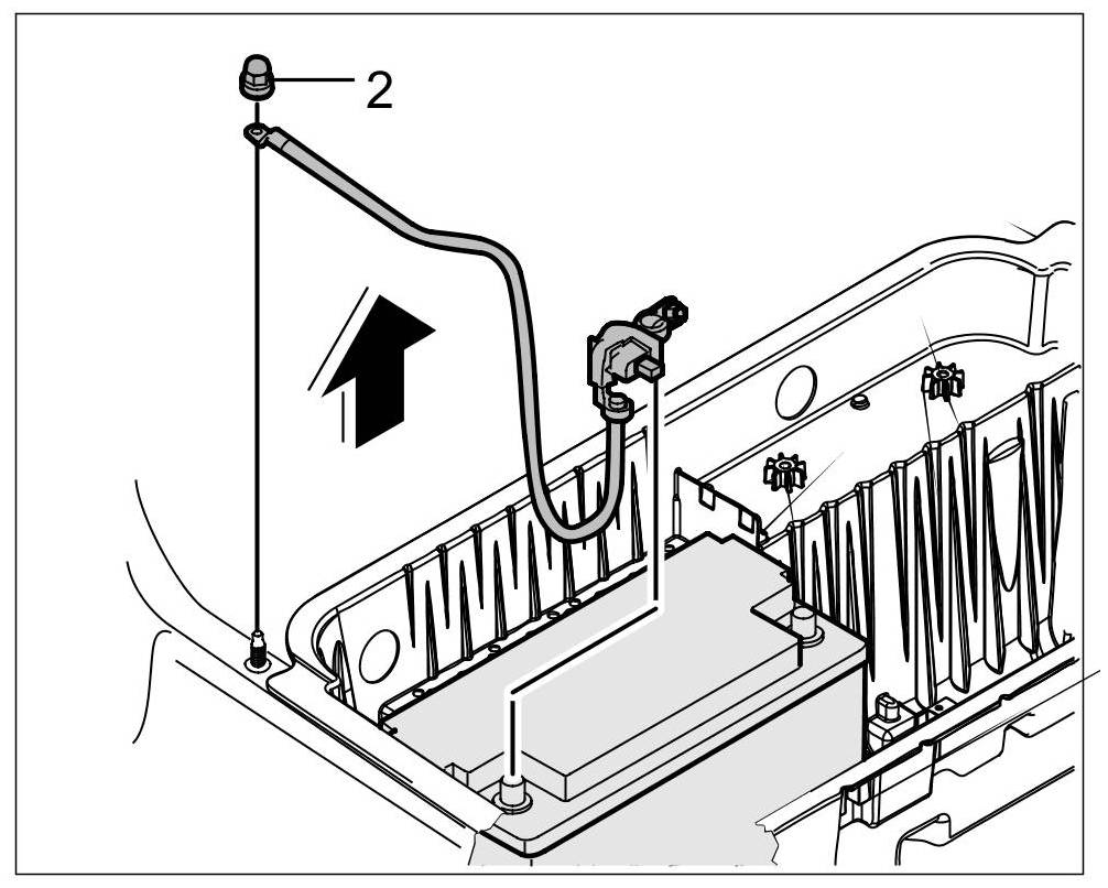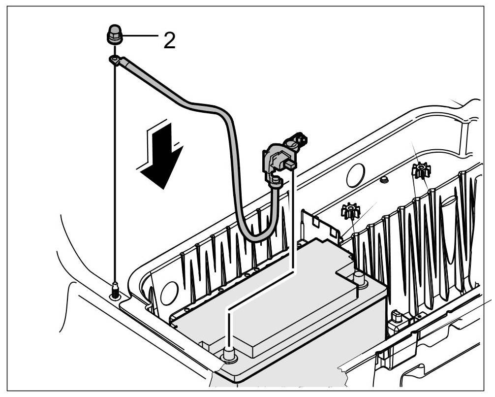 1. Connect ground strap to the ground point and secure with the fastening nut -2-. => Tightening torque: 9.7 Nm (7.5 ftlb.)