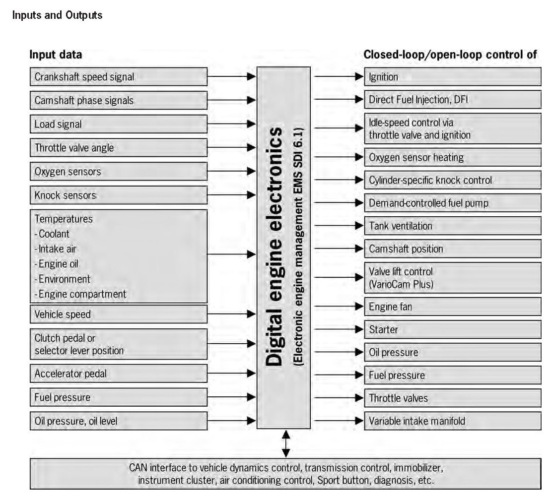 The high-performance electronic engine control unit EMS SDI 6.1 is used for the Panamera engines. This control unit has been specially designed to meet the requirements relating to direct fuel injection and VarioCam Plus. Of particular significance here is control of the injectors, since these are the central elements of the direct fuel injection system. The engine control also controls the throttle valve position (electronic accelerator) - this is a prerequisite for the Porsche Stability Management (PSM) system installed as standard equipment.