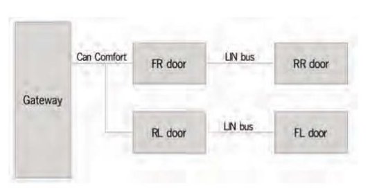 The door control units are connected to the vehicle electrical system voltage via terminal 30. Terminal 31 represents the connection to vehicle ground. The front door control units communicate with the other control units via CAN Comfort and with the rear door control units via the LIN bus.