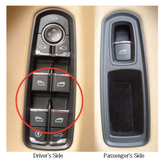 The power window switches are designed as voltage-coded dual press and pull switches. The driver's door module reads in one switch for each individual window and transmits the information for the front passenger's door and the rear doors via CAN to the relevant door control units. The other door control units read in the switch for their respective windows locally.