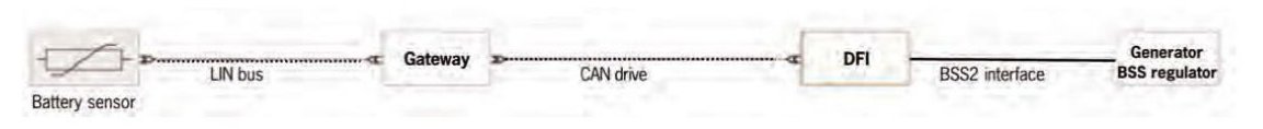 The battery sensor transmits information (battery voltage, charging current, battery temperature) = battery condition to the gateway, the gateway calculates the energy requirements and sends this requirement request signal via DFI to the BSS generator regulator. The BSS generator regulator controls the exciting voltage according to requirements (charging current) and communicates the generator's utilization status to the gateway.