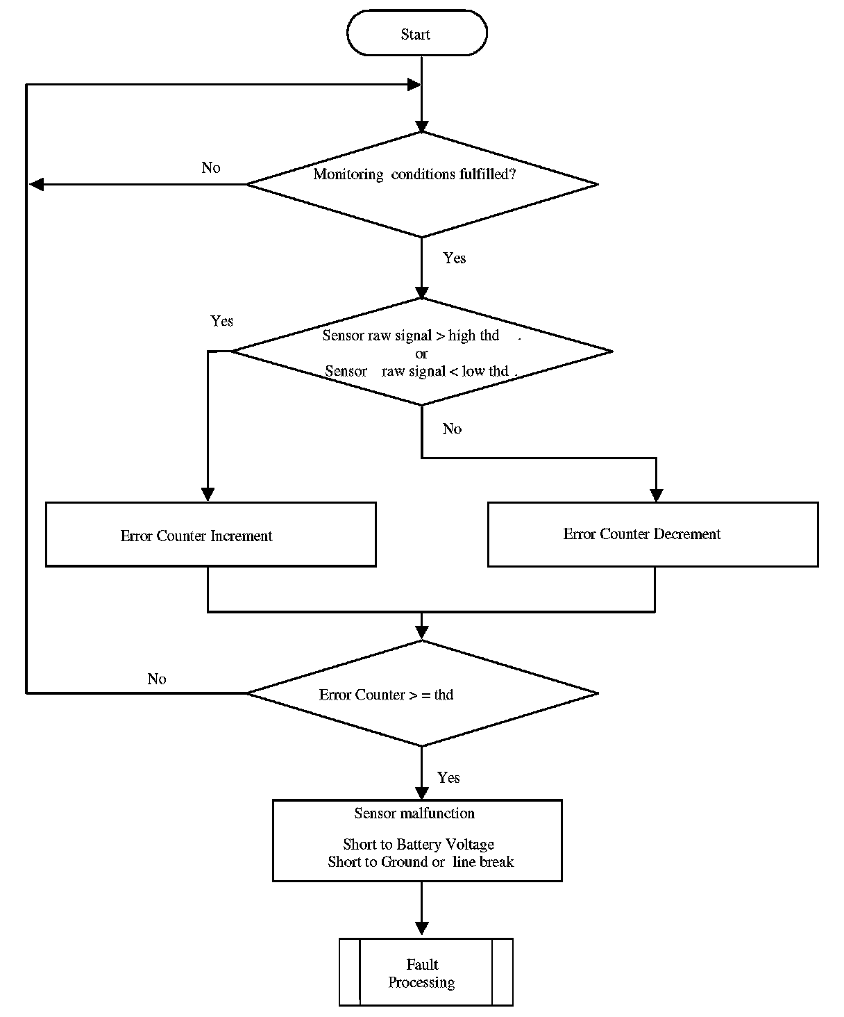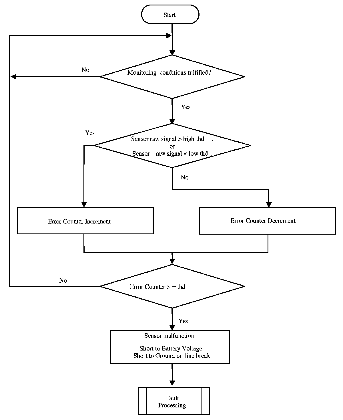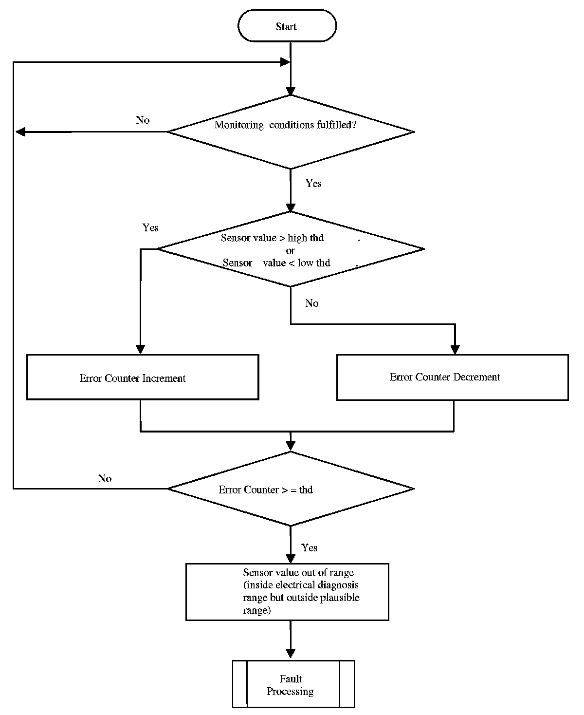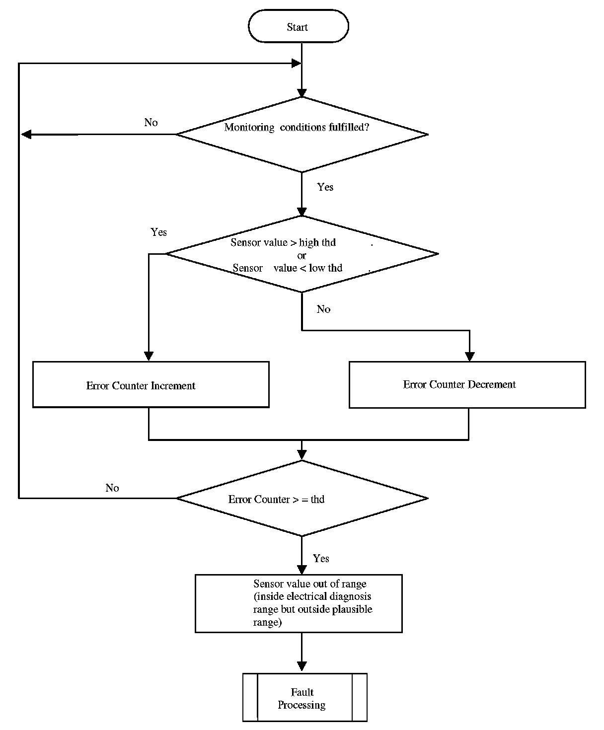 The purpose of this diagnosis is to detect electrical faults as defined in OBDI requirements. The input signal is the sensor voltage. If the voltage is out of a calibratable range, an error symptom is set and an error counter is de-bounced.