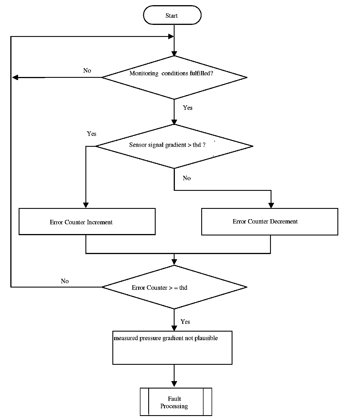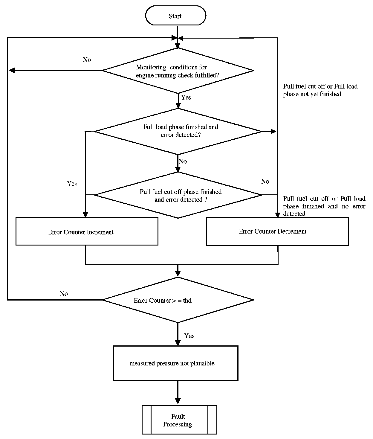 The purpose of this diagnosis is to detect faults as defined in OBD-II requirements. The input signal is the pressure value of the sensor. If the value is out of a calibratable range but inside the electrical error thresholds, an error symptom is set and an error counter is de-bounced.