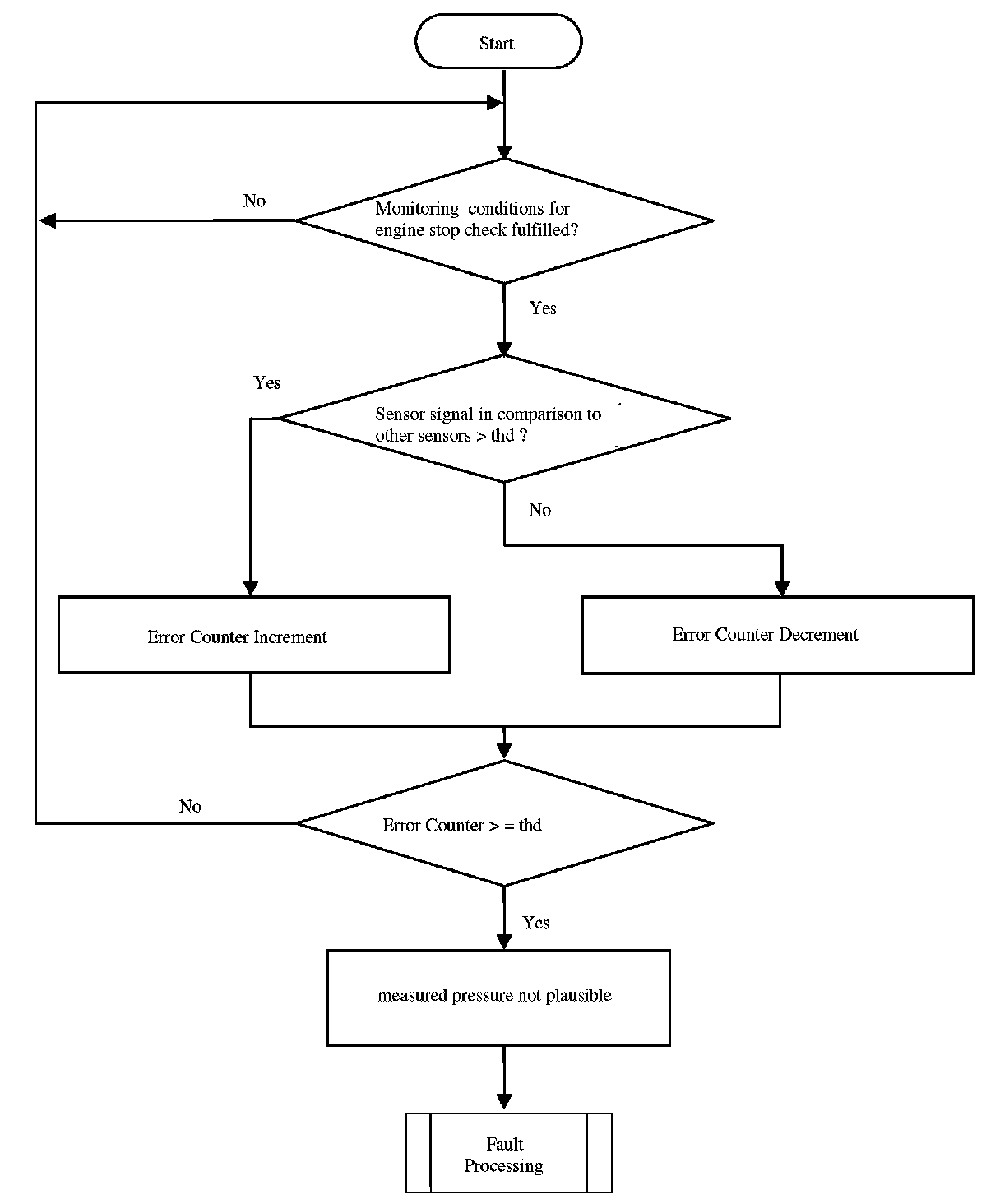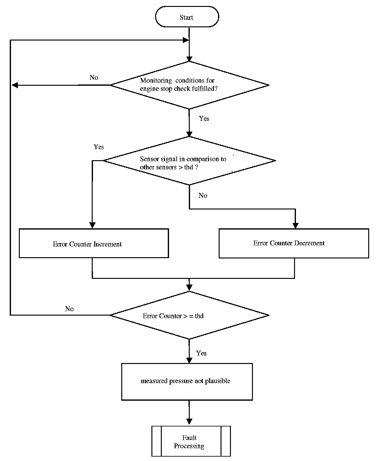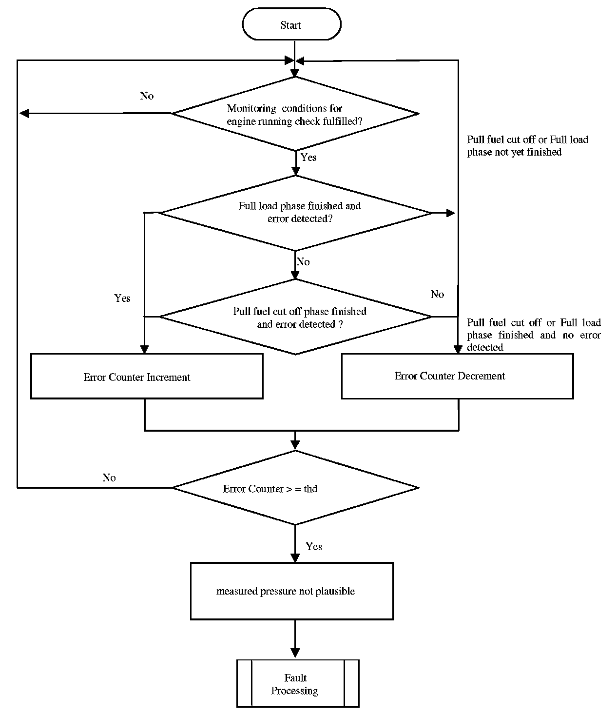 If the last power latch suspects no error (ambient pressure and manifold pressure sensor signal are nearly the same) and the current ambient pressure signal is too much different to the manifold pressure signal and the two signals (ambient and manifold) from last power latch, an error symptom is set and an error counter is de-bounced.