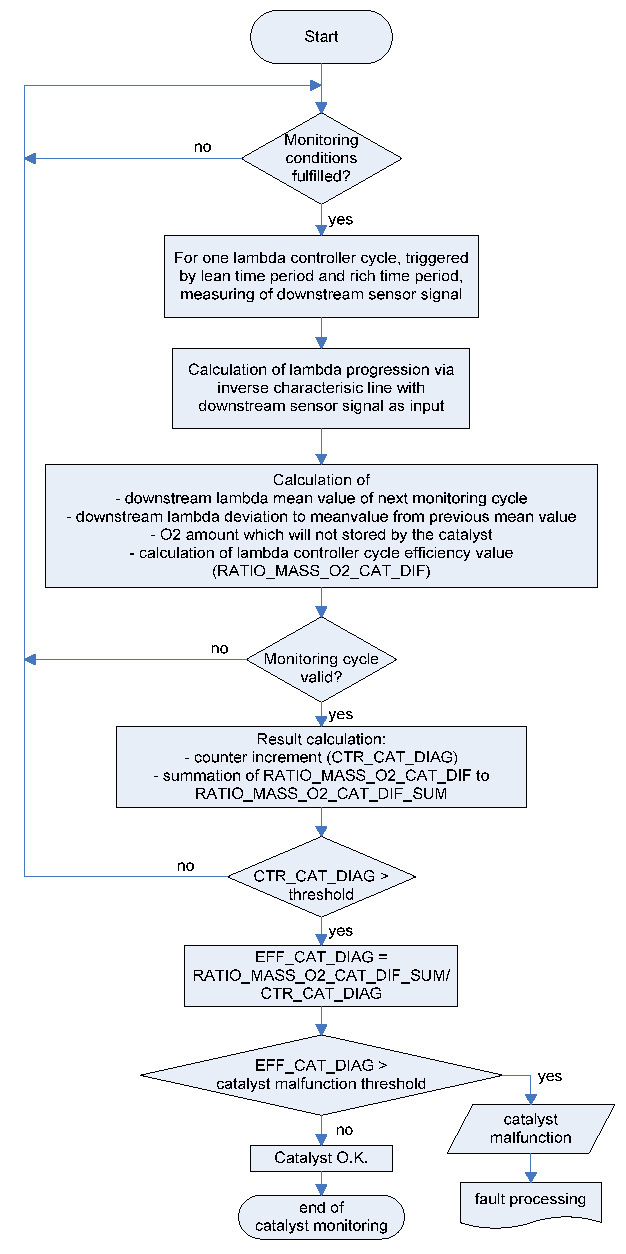 The first lean to rich cycle is only used to establish an average voltage value of the downstream sensor voltage. During subsequent lambda controller cycles the oxygen storage capacity (OSC) is based on the integrated (accumulated) value of the difference between the average value of the previous lean to rich cycle and the measured instantaneous voltage during the current lean to rich cycle. This surface integral will be normalized, weighted and corrected and is a measure of the catalyst efficiency. The catalyst system is considered malfunctioning, if after a specified number of monitoring cycles the average of the single efficiency values exceeds a threshold. The corresponding fault code is stored.