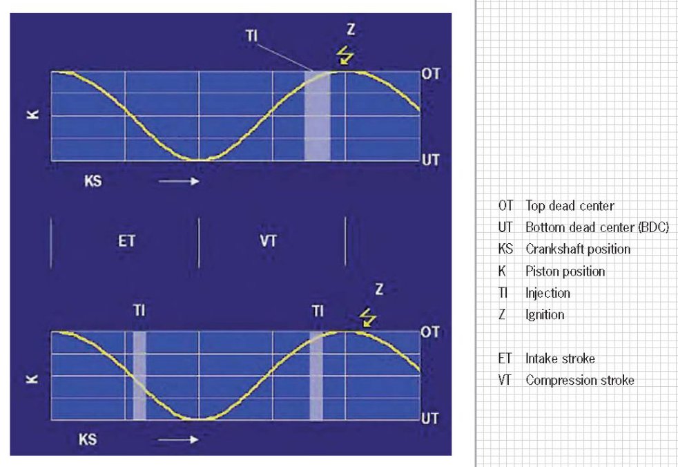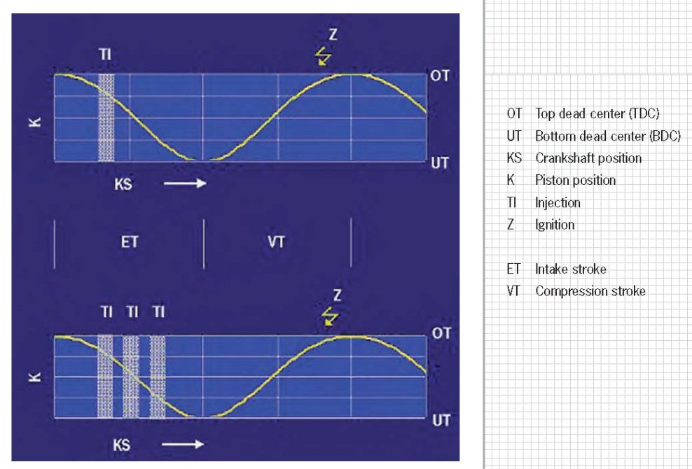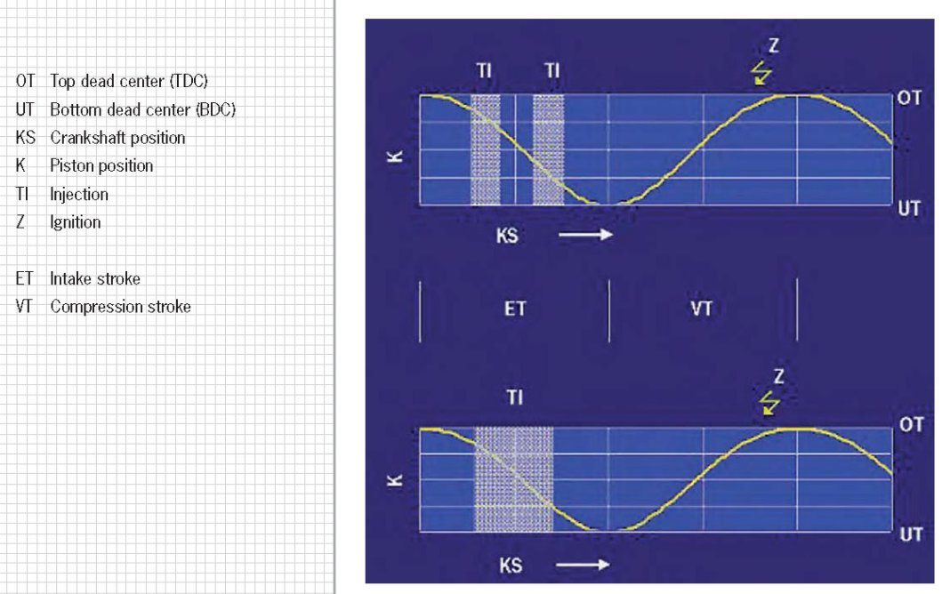 At high load and with an engine speed of over 3,500 rpm, injection takes place only once in the intake stroke, since there is not enough time to divide up the injection time at high engine speeds.