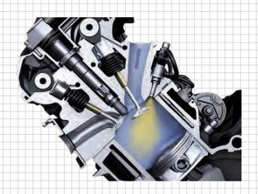 With high-pressure stratified-charge ignition, DFI injects the fuel very late during the engine start, just before the end of the compression stroke. In this so-called high-pressure stratified-charge injection process, a quantity of fuel is injected into the specifically molded piston recesses to create a coating around the spark plugs which produces an ignitable mixture. The piston recess ensures that the injected fuel is channelled directly to the spark plug. This reduces both the amount of fuel required and the emissions compared with intake manifold injection.