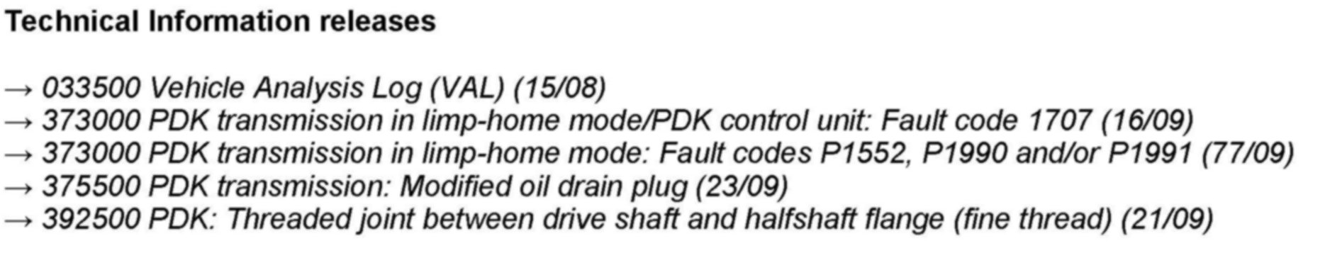 > Step "1.4" and "References" section now include the following link: --> 373000 PDK transmission in limp-home mode: Fault codes P1552, P1990 and/or P1991 (77/09).