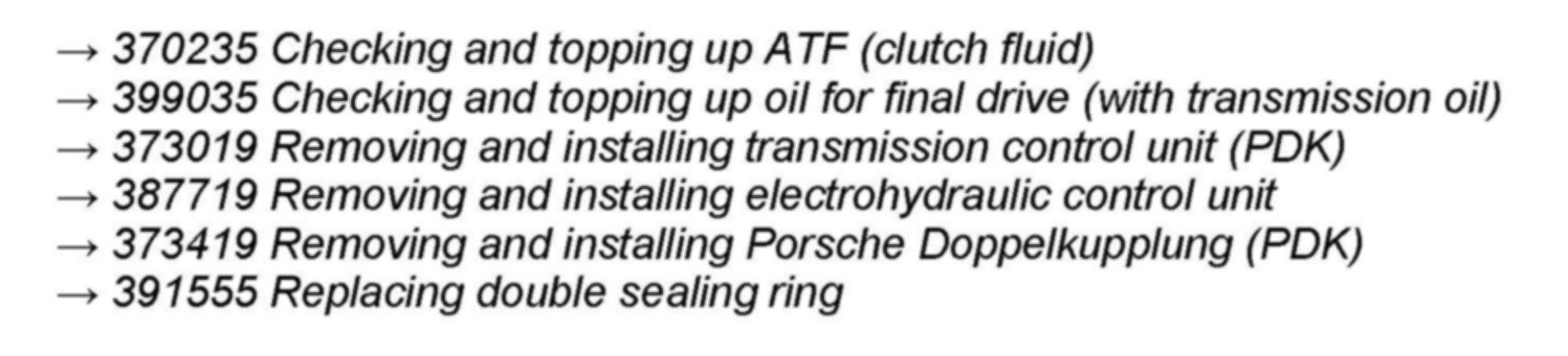 --> Section "Procedure: 2 - Repair measures in the event of leaks on the PDK transmission", Steps 1, 9 and 15 now include the following link: --> 391555 Replacing double sealing ring (previously --> 373419 Removing and installing Porsche Doppelkupplung (PDK)).